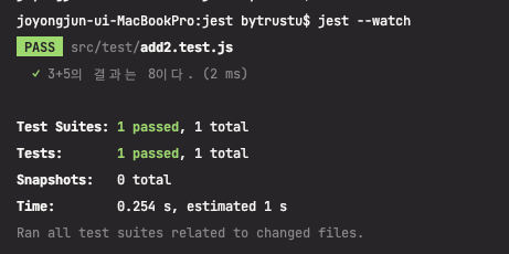 jest --watch 옵션으로 테스트를 실행하면 이미 커밋된 테스트에 대해서는 실행되지 않는다.